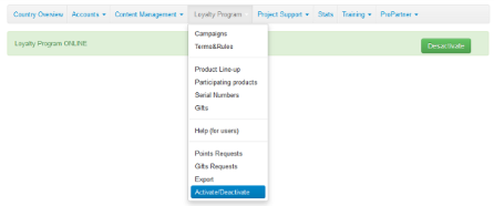 Once you completed the creation process of a campaign in the Admin Area, and you want this campaign to go live, go to Loyalty Program->Activate/Deactivate.