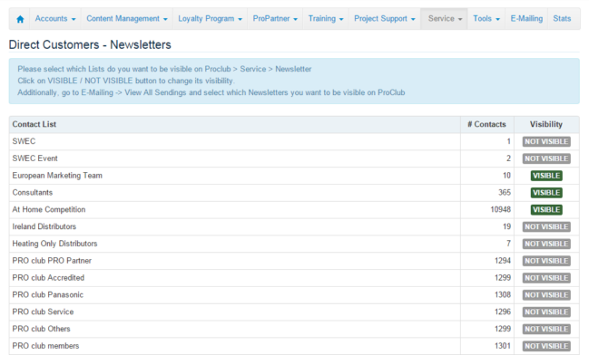 - You can click on ‘VISIBLE’ / ‘NOT VISIBLE’ button to change its visibility. If ‘Visible’ option is enabled the newsletters from the selected lists will appear on ‘Proclub’ -> ‘Service’ -> ‘Newsletter’.