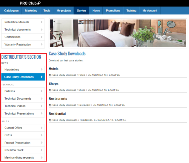 In Admin area, a new subsection under 'Service' tab is available to manage Direct Customers' contents. You can upload relevant files (PDF, excel sheets...) for 'Direct Customers' and they can consult and download them. 'Direct Customer' section is composed by 5 subsections: